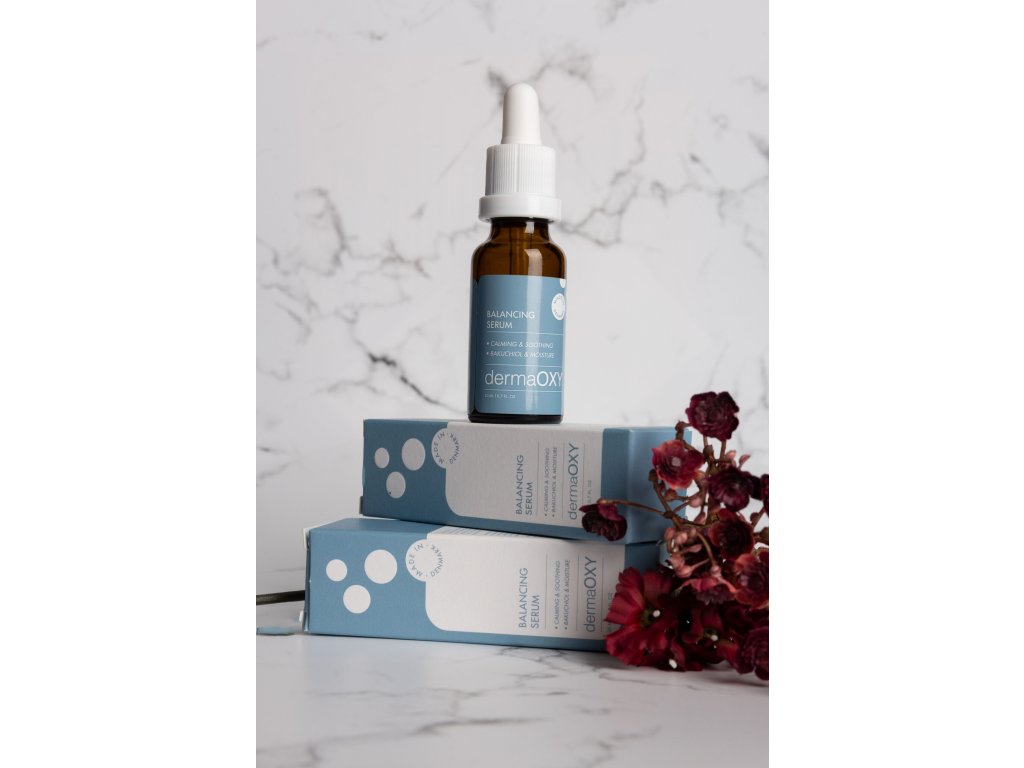 DermaOXY® BALANCING SERUM 20 ml je účinné sérum na problematickú pokožku s akne, rosaceou, kuperózou, začervenaním, aplikované pomocou kyslíkovej terapie - oxyterapie DermaOXY®. BALANCING SERUM bolo špeciálne vyvinuté na obnovu prirodzenej rovnováhy pleti a redukciu začervenania. Toto sérum upokojuje podráždenie, zmierňuje zápaly v pokožke a aktívne prispieva k obnoveniu kožnej bariéry, čím ju robí silnejšou a odolnejšou.