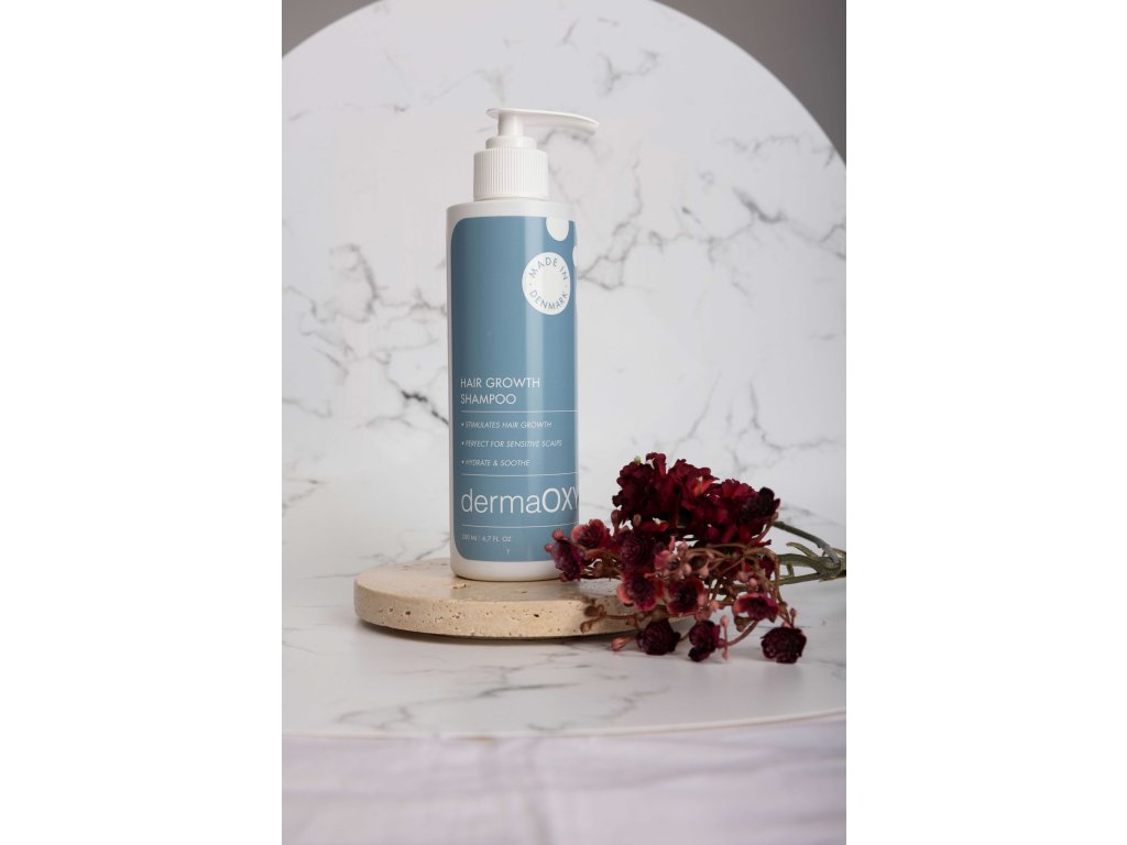 Šampon na rast vlasov DermaOXY HAIR GROWT SHAMPOO je obsahuje výživnou zmesou rastlinných extraktov, vitamínov a peptidov, ktoré posilňujú vlasy od korienkov po končeky.